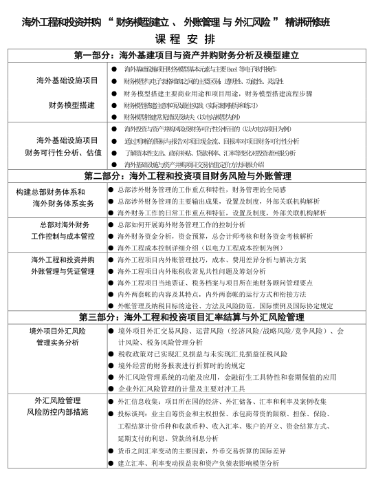 内训辅导:海外工程和投资并购“财务模型建立、外账管理与外汇风险”精讲研修班