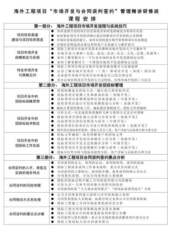 内训辅导:海外工程项目“市场开发与合同谈判签约”管理精讲研修班