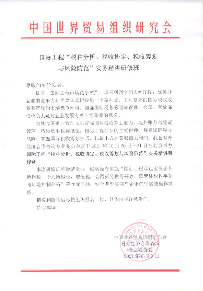 关于举办国际工程“税种分析、税收协定、税收筹划与风险防范”实务精讲研修班的邀请函