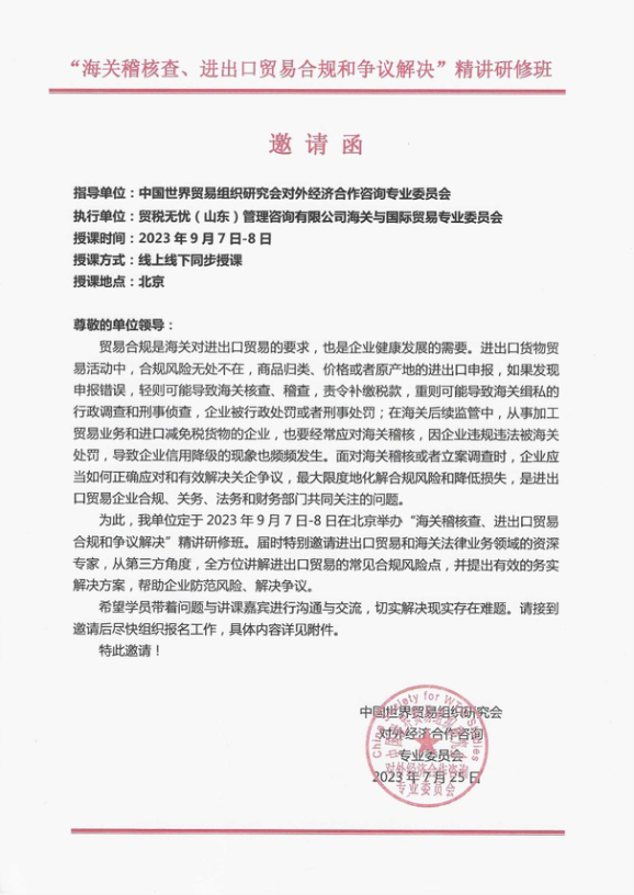 关于举办“海关稽核查、进出口贸易合规和争议解决”精讲研修班的邀请函