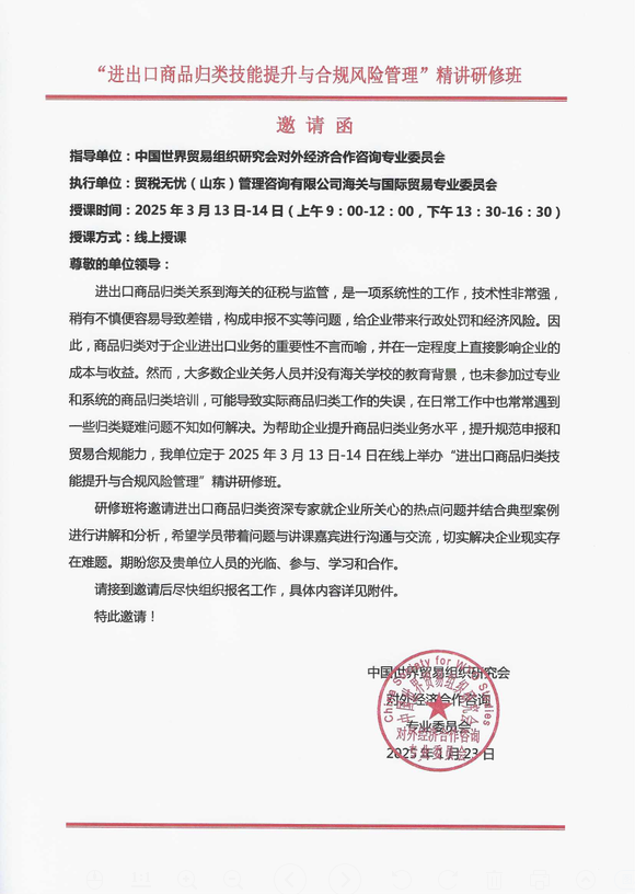 关于举办“进出口商品归类技能提升与合规风险管理”精讲研修班的邀请函
