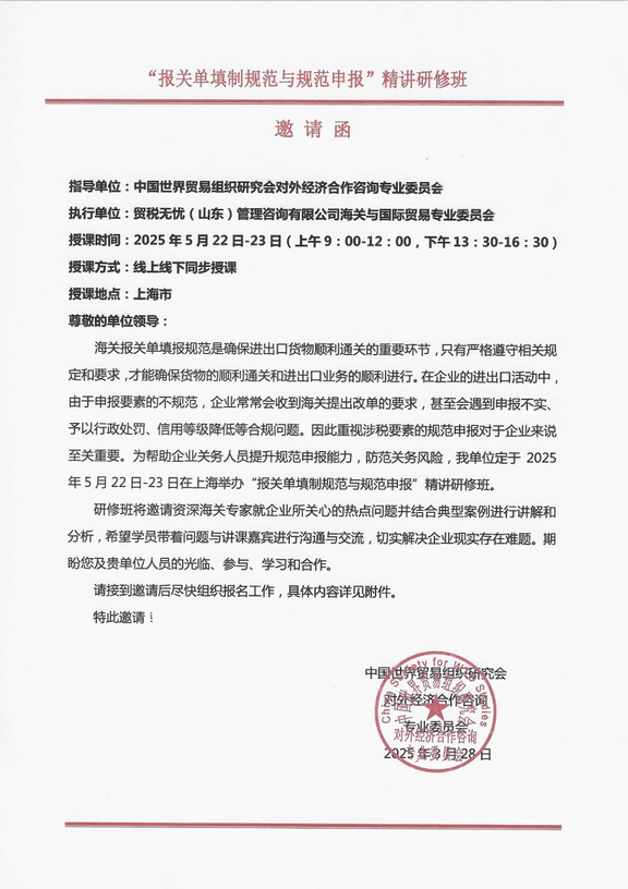 关于举办“报关单填制规范与规范申报”精讲研修班的邀请函