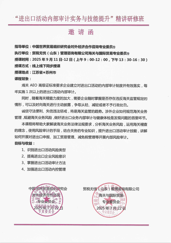 关于举办“进出口活动内部审计实务与技能提升”精讲研修班的邀请函